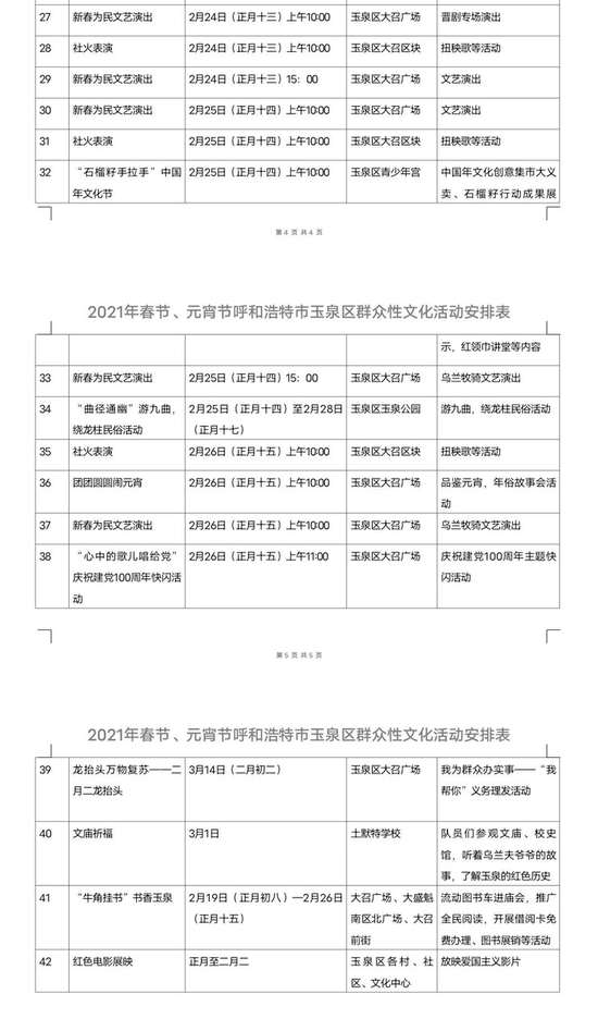 2021年春节、元宵节呼和浩特市玉泉区群众性文化活动于2021年2月17日(正月初六)至2021年3月14日(二月初二)举办。
