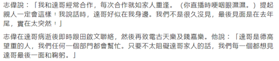 曾志伟说:“达哥是德高望重的人,我们任何一个部门都会帮忙。只要不太阻碍达哥家人,我们每一个都想见达哥最后一面,给他一个鞠躬。”