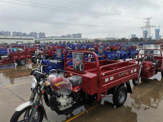 在厂区内,一辆满载三轮摩托车的大货车正准备驶离装车台。新京报记者查看这些三轮摩托车发现,这些车辆生产日期均为2020年2月27日,供油系统为化油器。