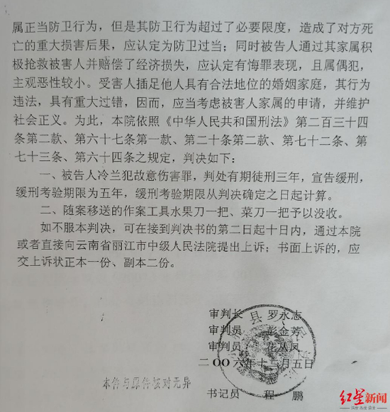 彼时,永胜县人民法院认定,冷兰“在受到他人持刀威胁的情况下,用自身携带的水果刀相对抗”,系防卫过当,判处冷兰有期徒刑3年,缓刑5年。