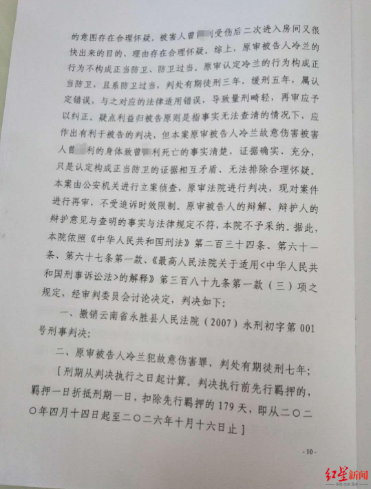 丽江中院经审查认为,检方的抗诉理由成立,指令华坪县人民法院对本案进行再审。2020年4月15日,华坪县人民法院再审作出改判,以故意伤害罪,判处冷兰有期徒刑7年。
