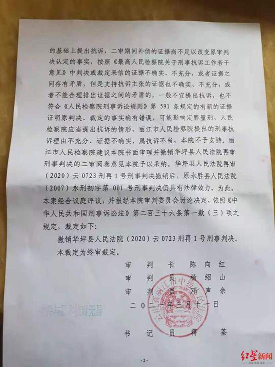红星新闻记者从接近丽江中院的消息人士处获悉,2021年3月11日,丽江中院作出终审裁定,撤销华坪县人民法院再审时对冷兰作出的刑事判决,永胜县人民法院2006年认定冷兰防卫过当的判决仍具有法律效力。