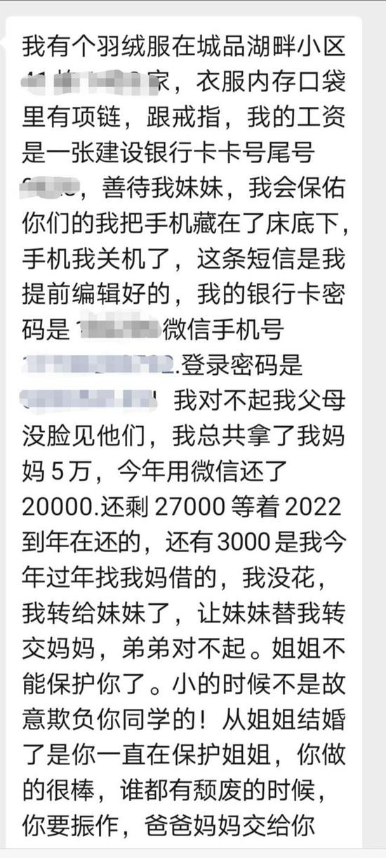 杨晴7点25分醒来后才看到。遗言中,姐姐说自己对不起父母,没脸见他们;希望妹夫善待妹妹;还嘱咐弟弟振作起来,“爸爸妈妈交给你了”。