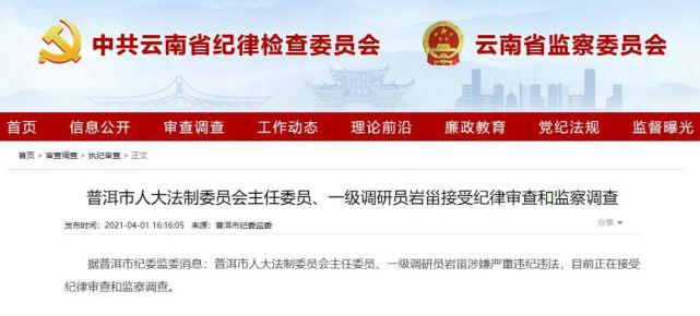 据普洱市纪委监委消息:普洱市人大法制委员会主任委员、一级调研员岩甾涉嫌严重违纪违法,目前正在接受纪律审查和监察调查。