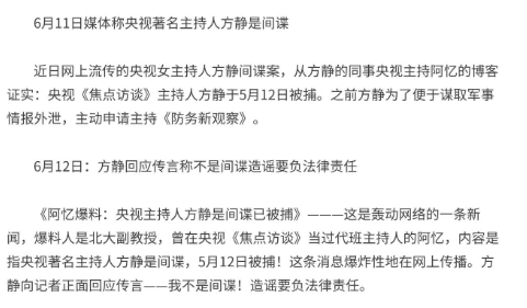 2009年曾在《焦点访谈》担任过代班主持的阿忆在微博爆料称方静被捕,阿忆称方静还有另一种身份,爆料一出,立马就引起热议,对方静的工作造成了很大的影响,尽管方静很快做出了澄清否认,并表示造谣要负法律责任,可是方静还是受影响停止了工作。
