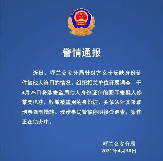 4月30日晚,呼兰公安分局针对涉嫌盗用身份证件事件发布警情通报。
