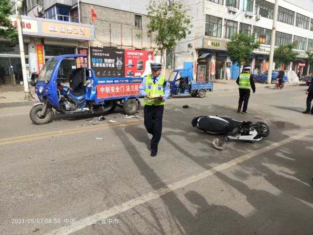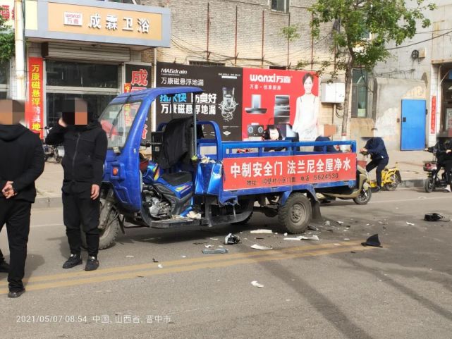 事故现场一片狼藉,电摩碎片一地,旁边血迹斑斑。据目击者称:三轮摩托车是正常行驶,骑电摩的撞了上去,是一位年轻男子,事故发生后脸部血流不止,腿部有变形迹象,伤势较重!