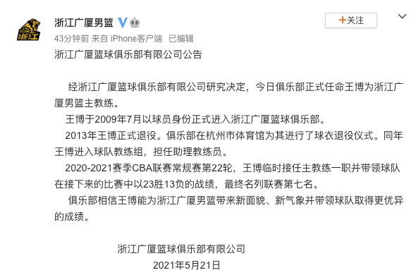 @浙江广厦男篮 微博5月21日消息,浙江广厦篮球俱乐部有限公司发布公告称,经浙江广厦篮球俱乐部有限公司研究决定,今日俱乐部正式任命王博为浙江广厦男篮主教练。