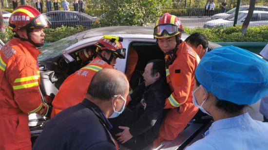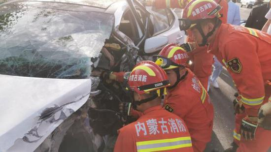 “我们接到报警后,立刻出动1车7人赶赴现场,7时05分,抵达现场后发现,一辆小车和一辆中型货车发生碰撞,事故现场还未来得及清理,一辆在快速路由东向西行驶的白色小轿车躲闪不及,又撞了上去。白色轿车上一名大约36岁的男子和其母亲以及孩子被困车内,车内还拉着行李。”6月3日,当日出警的呼和浩特市消防救援支队特勤大队一站消防员韩忠奇在接受记者采访时回忆,当时白色轿车车头严重变形,主驾驶和副驾驶两侧车门均打不开,司机左腿被卡住无法脱身,孩子在车内一直痛苦的呻吟,情况十分危急。消防员立即使用液压破拆工具展开营救,首先通过车门一侧缝隙将孩子解救出来,随后通过破拆将司机及其母亲成功救出,随后移交给120医护人员进行救治。