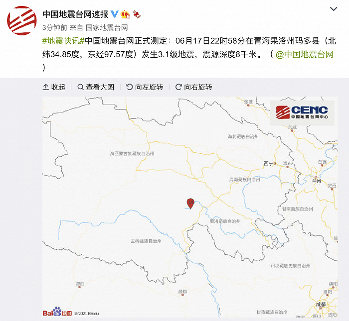 青海果洛州玛多县发生3.1级地震,震源深度8千米 界面新闻 界面新闻官方账号 2021.06.1723:10 关注 @中国地震台网速报 微博消息,中国地震台网正式测定:06月17日22时58分在青海果洛州玛多县(北纬34.85度,东经97.57度)发生3.1级地震,震源深度8千米。