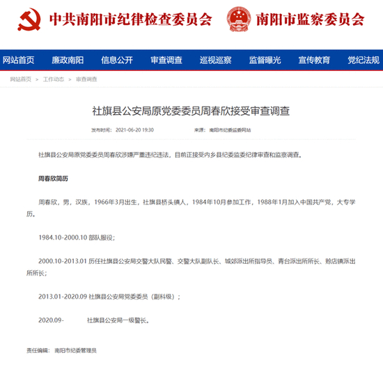 社旗县公安局原党委委员周春欣涉嫌严重违纪违法,目前正接受内乡县纪委监委纪律审查和监察调查。