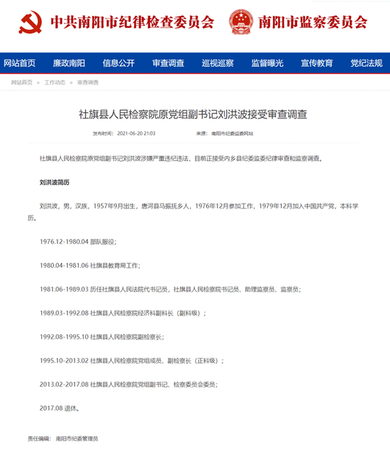 社旗县人民检察院原党组副书记刘洪波涉嫌严重违纪违法,目前正接受内乡县纪委监委纪律审查和监察调查。