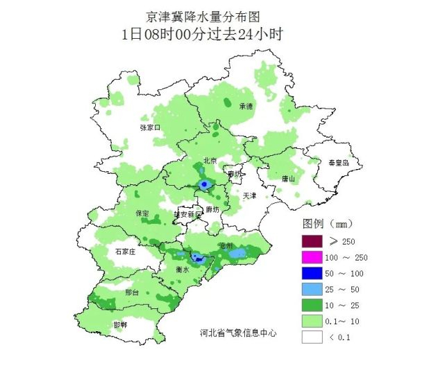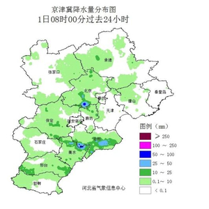 河北省气象台7月1日8时发布天气实况:6月30日8时-7月1日8时,张家口东部和南部、承德中西部、唐山中北部、保定、廊坊中部、石家庄西部、沧州、衡水、邢台、邯郸等地出现降雨,降雨区平均降水量5毫米。保定南部和东北部、廊坊中部、沧州南部、衡水北部、邢台西南部有52个站点降水量超过25毫米(大雨),其中保定东北部、沧州南部、衡水东部有5个站点超过50毫米(暴雨),阜城蒋坊最大为75.1毫米(暴雨),涿州永定河小时最大降水达54.2毫米。张家口、承德、雄安、石家庄、沧州、衡水、邢台等地有17个县(市)出现17米/秒以上的短时大风,威县、清河达25米/秒(10级);南宫、赤城、孟村、盐山、海兴、曲阳、武强、景县出现冰雹,武强冰雹最大直径达1.2厘米。