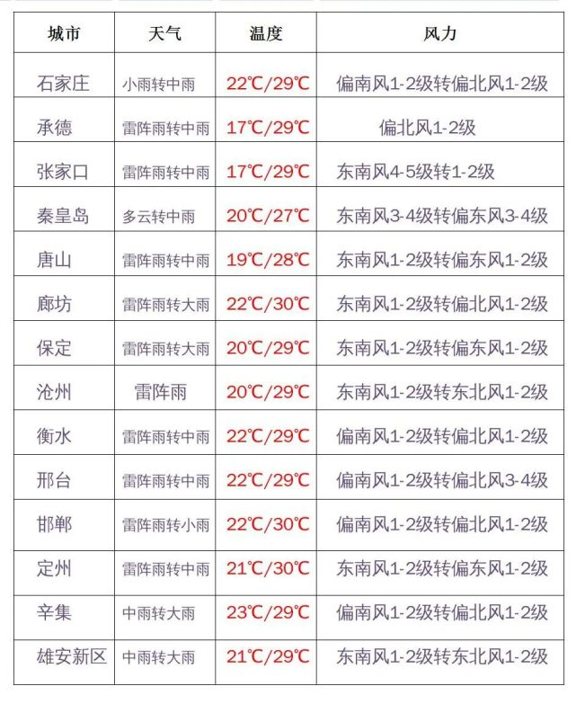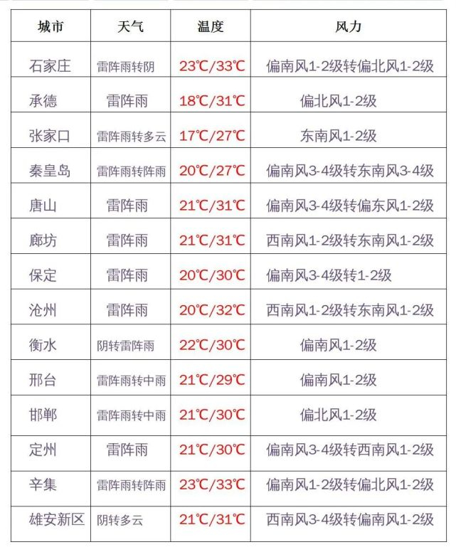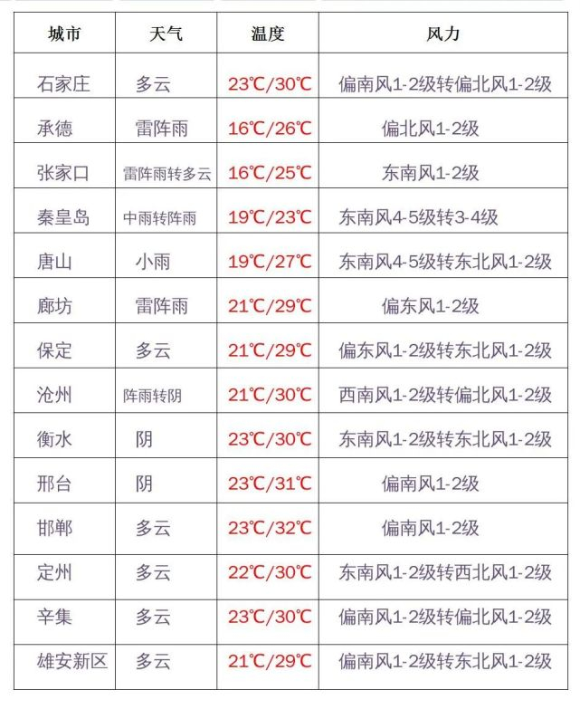 今天下午到夜间,全省多云间阴,大部分地区有雷阵雨或阵雨,其中承德南部、唐山、保定东部、雄安新区、廊坊、石家庄东部、沧州、衡水局地有中到大雨,个别地点有暴雨,雷雨时局地伴有短时强降水、短时大风、冰雹等强对流天气。