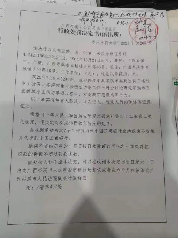 2021年7月20日,北青-北京头条记者从律师高鹏处了解到,近日他收到了广西岑溪市公安局城中派出所于今年7月7日做出的行政处罚决定书的复印件。北青-北京头条记者从该处罚决定书上看到,警方认定冼某某于一年前对高鹏实施的谩骂等行为违反相关规定,对冼某某罚款500元。而据当地相关部门的调查显示,事发时,冼某某系岑溪市委政法委副书记。高鹏表示,事发时冼某某在会议中对他泼白开水,并实施了谩骂、扔文件资料、布包等行为,造成高鹏受伤住院,“当时冼某某一连骂了我8次脏话。”