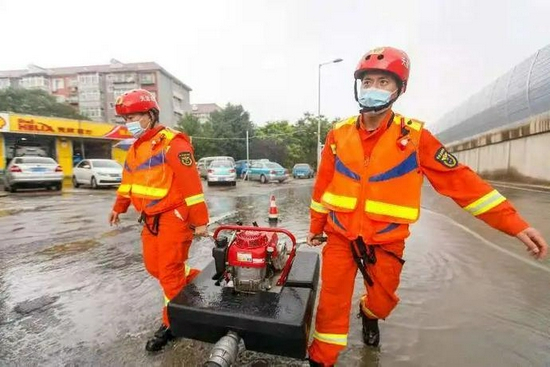 南开区消防救援支队指战员携抽水泵赶赴出现积水地区,协助排水部门清理积水,把降雨给市民出行带来的影响降至最低