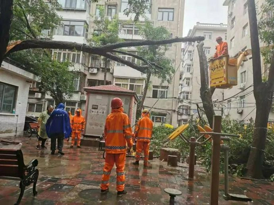 和平区兴隆南里小区一棵大树倒塌,园林和社区工作人员积极抢险,未造成人员、车辆损失