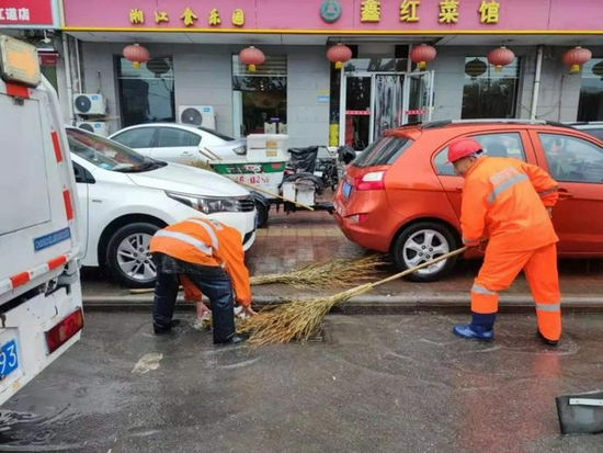 河西区湘江道上,环卫工人清理覆盖排水井的垃圾,加速道路排水