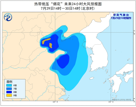 29日14时至30日14时,渤海、渤海海峡、黄海、河北沿海、天津沿海、山东半岛沿海、辽东半岛沿海、江苏沿海将有6-7级大风,阵风8-9级,其中渤海、山东半岛南部海域的风力可达8-9级、阵风10-11级。