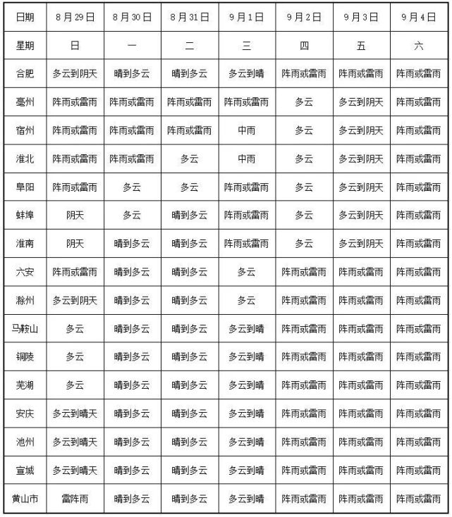 31日-9月1日:淮北地区阴天到多云有阵雨或雷雨,部分地区中雨;淮河以南多云到晴天。