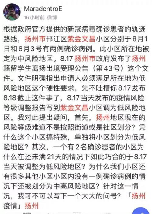 扬州一高端小区曾确诊两例新冠被单独调为低风险引质疑!当地政府仍未回应