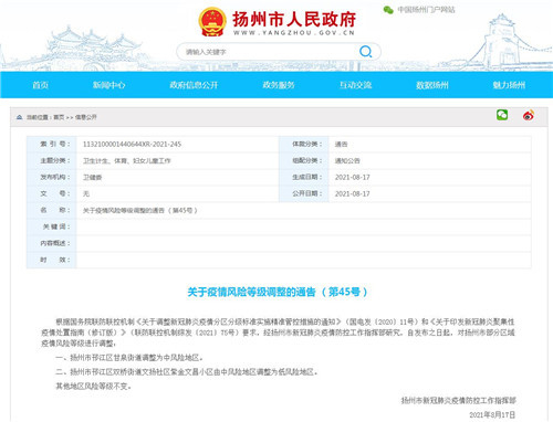 扬州政府官网显示,8月17日当天,扬州卫健委共对外发布了4份文件,其中43号公告题为《扬州籍留学生离扬出境受理公告》, 45号通告为《关于疫情风险等级调整的通告》。