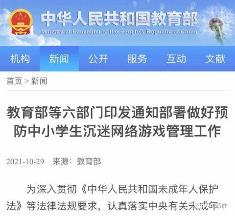 教育部等6部门发文进一步加强预防中小学生沉迷网络游戏管理