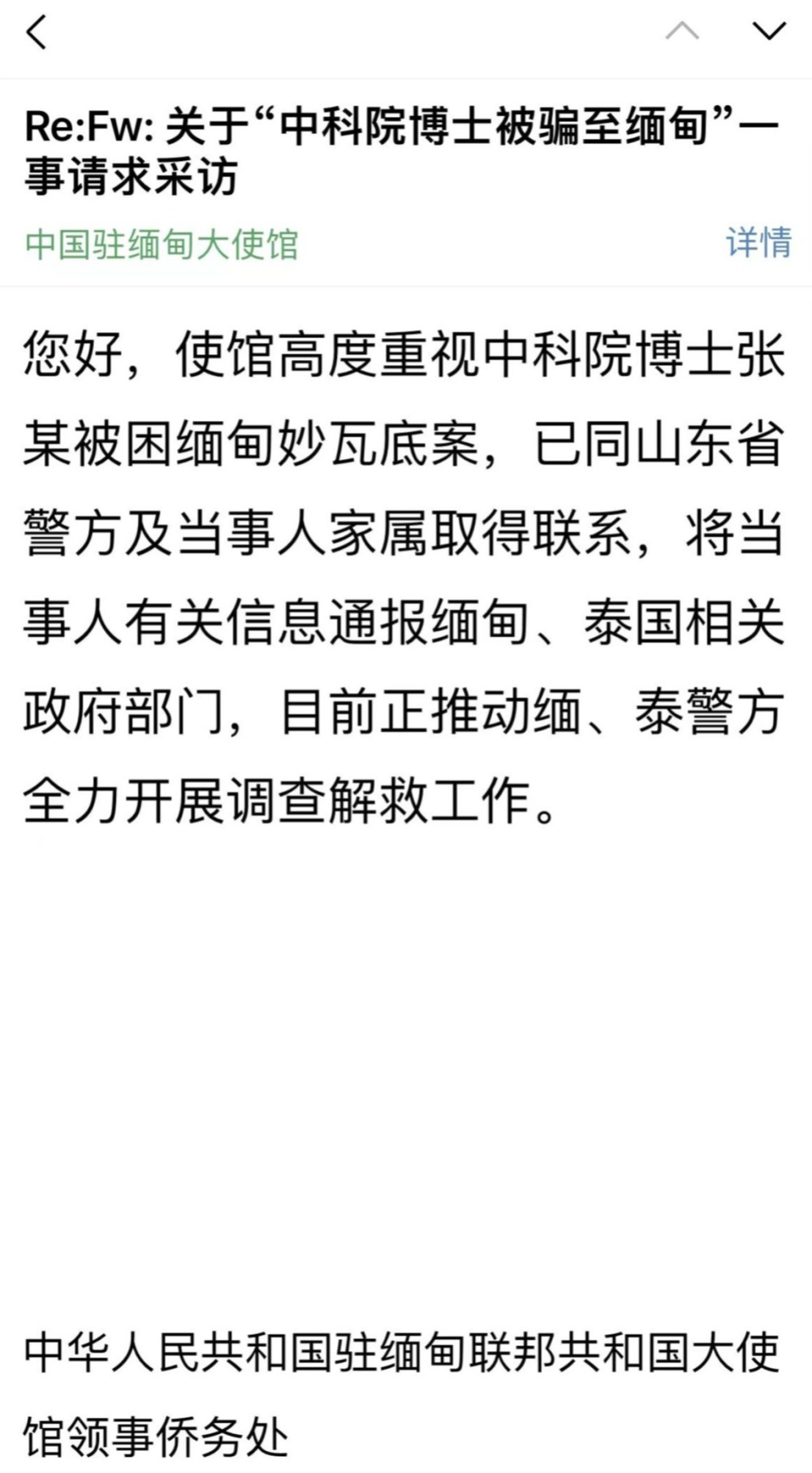 针对此事,海报新闻记者联系了中华人民共和国驻缅甸联邦共和国大使馆。8月22日,大使馆领事侨务处回复海报新闻记者邮件称,“使馆高度重视中科院博士张某被困缅甸妙瓦底案,已同山东省警方及当事人家属取得联系,将当事人有关信息通报缅甸、泰国相关政府部门,目前正推动缅、泰警方全力开展调查解救工作。”