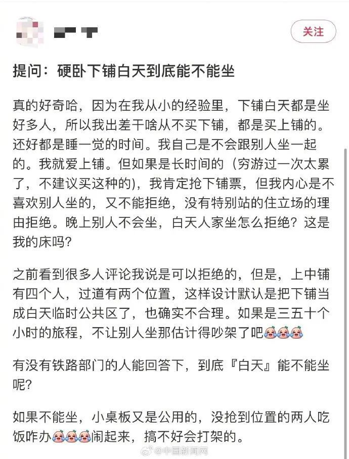 有网友表示自己购买到卧铺火车下铺车票时,常有其他铺位乘客坐在自己的床上,自己不喜欢但又不好意思拒绝。有人跟帖表示,如果好好沟通,有分寸感,并不讨厌别人暂时坐自己的铺位,矛盾的根源是有些人坐自己的铺时没有分寸感,“一屁股坐我脚上还不吱声”。