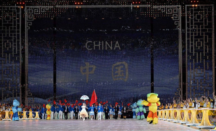 ↑中国代表团在入场仪式上。