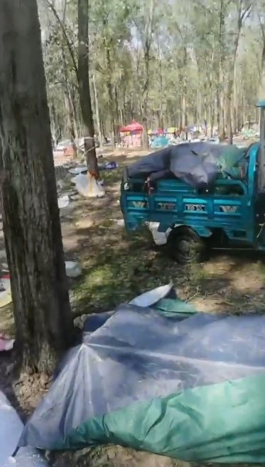还有网友称,离开营地时,看到大量很多人开着三轮车、电瓶车围在营地外围,每辆车子上都装有物品。一名网友发布的视频显示,他在指责盗窃者行径时,现场还停放着一辆来拖物品的三轮车。有网友称,这些来拖物品的是附近的村民。