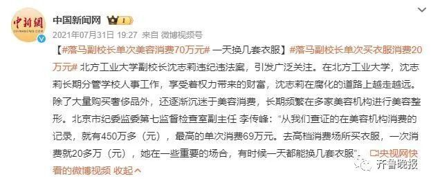 北京市纪委监委工作人员称,查证的沈志莉在美容机构消费的记录就有450多万元,最高的单次消费69万元。她去高档消费场所买衣服,一次消费就20多万,她在一些重要的场合,有时候一天都能换几套衣服。