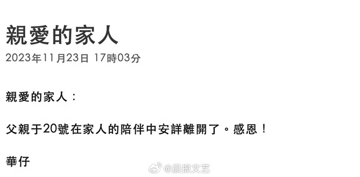 #刘德华父亲去世##刘德华父亲逝世# 11月23日,刘德华在华仔天地官网公开了父亲于11月20日离世的消息,“亲爱的家人:父亲于20号在家人的陪伴中安详离开了,感恩!华仔。”