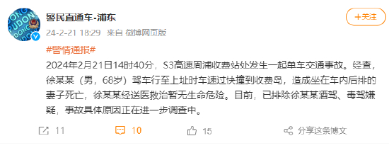 2024年2月21日14时40分,S3高速[沪奉高速]上海浦东周浦收费站处发生一起单车交通事故。经查,徐某某(男,68岁)驾车行至上址时车速过快撞到收费岛,造成坐在车内后排的妻子死亡,徐某某经送医救治暂无生命危险。目前,已排除徐某某酒驾、毒驾嫌疑,事故具体原因正在进一步调查中。