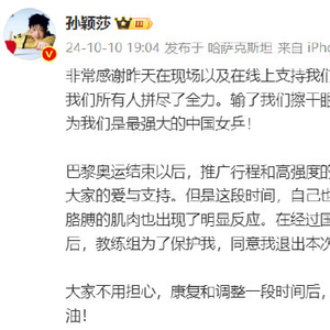 @孙颖莎 发博:非常感谢昨天在现场以及在线上支持我们的球迷朋友们,竞技体育一定会有输赢,我们所有人拼尽了全力。输了我们擦干眼泪,下次赢回来!我相信我们的团队,因为我们是最强大的中国女乒!