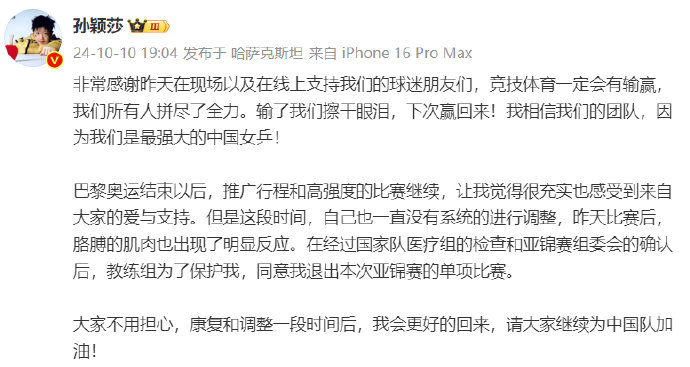 巴黎奥运结束以后,推广行程和高强度的比赛继续,让我觉得很充实也感受到来自大家的爱与支持。但是这段时间,自己也一直没有系统的进行调整,昨天比赛后,胳膊的肌肉也出现了明显反应。在经过国家队医疗组的检查和亚锦赛组委会的确认后,教练组为了保护我,同意我退出本次亚锦赛的单项比赛。