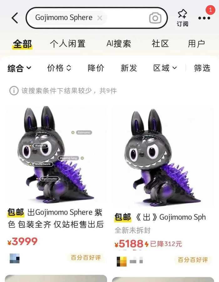 李晨晒出的这只labubu和常见的毛茸茸的labubu长得还有点不一样,背上有着尖尖的紫色的刺。还有粗壮的尾巴。在泡泡玛特2020年发布的一条展会商品发售信息中可以找到同款,这款同样来自设计labubu的艺术家龙家升,名字为gojimomo sphere,设计灵感来源于经典怪兽哥斯拉造型,泡泡玛特的推文介绍该款售价为899元一只。当前在二手平台上搜索,紫色的gojimomo sphere数量很稀少,价格在两三千元不等,其中一款全新未拆封的售价5188元。