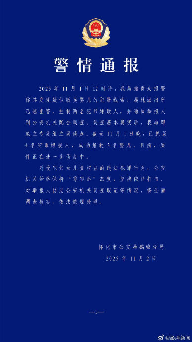 截至11月1日晚,已抓获4名犯罪嫌疑人,成功解救3名婴儿。目前,案件正在进一步侦办中。