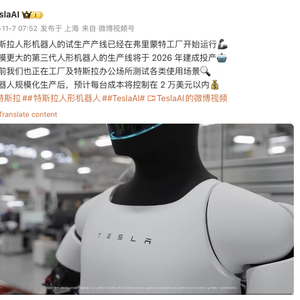 特斯拉预计其人形机器人成本每台将控制在2万美元以内
