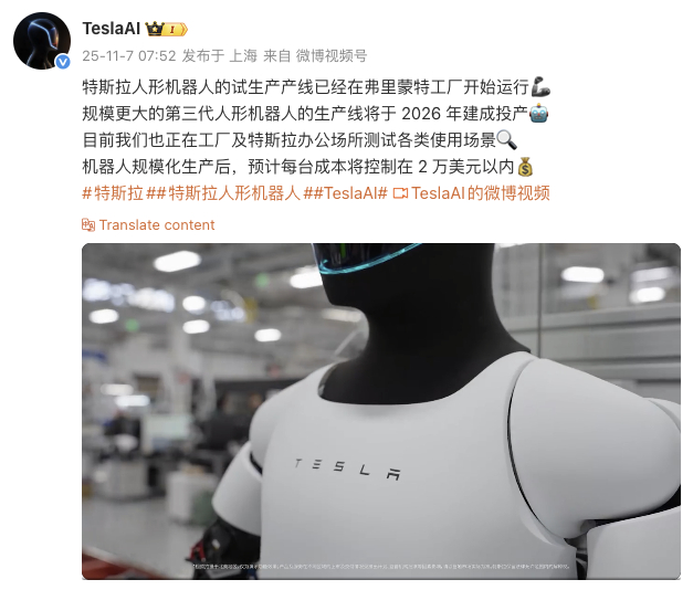11月7日,特斯拉宣布其人形机器人的试生产产线已经在弗里蒙特工厂开始运行,规模更大的第三代人形机器人的生产线将于2026年建成投产。目前公司也正在工厂及特斯拉办公场所测试各类使用场景,机器人规模化生产后,预计每台成本将控制在2万美元以内。
