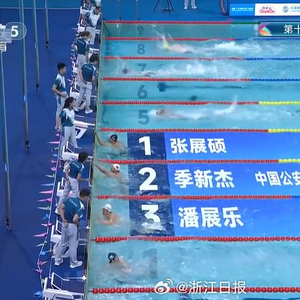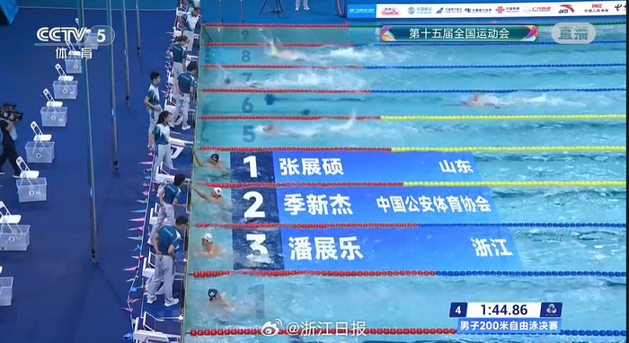 #微观全运会#[#张展硕200自金牌# 转发祝贺!]#张展硕破全国青年纪录##第十五届全运会#男子200米自由泳决赛,张展硕@张瑾赛 夺冠,季新杰@DANST季新杰 夺银,潘展乐@潘展乐 夺铜。祝贺!