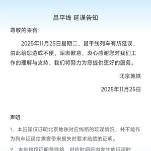 [#北京地铁通报昌平线延误# ]#北京地铁就昌平线延误道歉# 11月25日,北京地铁发布昌平线延误告知:2025年11月25日星期二,昌平线列车有所延误,由此给您造成不便,深表歉意,衷心感谢您对我们工作的理解与支持,我们将努力为您提供更好的服务。
