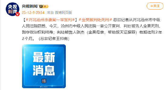 [河北沧州杀妻案一审宣判]#金昊被判处死刑# 总台记者从河北沧州市中级人民法院获悉,今天,沧州市中级人民法院一审公开宣判,判处被告人金昊死刑,剥夺政治权利终身;判处被告人张杰(金昊母亲,帮助毁灭证据罪)有期徒刑2年2个月。(总台记者王帅南)