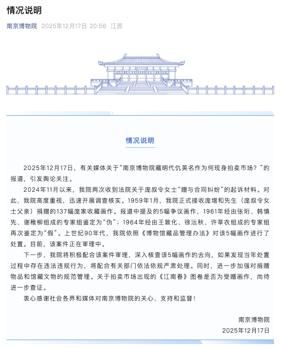 江苏文旅厅回应“南博藏品现身拍卖”