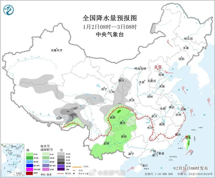 #全国天气提示# 一、国内天气情况 1.实况 (1)昨日甘肃宁夏陕西等地出现降雪天气 昨日8时至今日6时,甘肃中部和东南部、宁夏南部、陕西中南部、西藏东南部等地部分地区出现小到中雪或雨夹雪天气,局地大雪;重庆南部和东北部、贵州东北部等地部分地区出现中雨,局地大雨;台湾岛北部出现大雨或暴雨,局地大暴雨。 (2)内蒙古黑龙江等地出现降温 昨日8时至今日6时,新疆北部、青海西部、内蒙古东南部等地部分地区出现7~8级阵风,局地9~10级。今日6时较昨日6时,内蒙古东北部、黑龙江西北部、吉林中部、西藏东北部等地部分地区气温下降6~8℃,局地降温10℃以上。 2.重点天气预报 (1)中东部有雨雪天气 预计,2025年12月31日至2026年1月1日,西藏大部、西北地区东部、华北南部、黄淮西部、江汉、江淮等地有小到中雪或雨夹雪,部分地区大雪或暴雪,其中,江汉、江淮等地雨转雪;西南地区东部、江南、华南等地有小到中雨,局地大雨。 预计2025年12月31日08时至2026年1月1日08时,甘肃东部、陕西中南部、山西西南部、河南中西部和南部、安徽西部、湖北北部和西部、重庆东北部等地部分地区有大雪,其中,陕西中部、河南南部、安徽大别山区、湖北北部等地部分地区有暴雪(10~15毫米)。上述地区新增积雪深度5~10厘米,局地可达12~15厘米(见图1)。中央气象台12月31日06时继续发布暴雪蓝色预警。 (2)冷空气将影响中东部地区 受寒潮影响,2025年12月31日至2026年1月2日,我国中东部的部分地区将自北向南出现降温,陕西大部、山西南部、河南中南部、江汉、江淮、江南、西南地区东部、华南中北部等地日平均或最低气温将下降6~10℃,江汉东部、江南北部和东部等地部分地区降温可达10~12℃(见图2)。2026年1月3日早晨,最低温度0℃线将南压至江南南部(见图3)。 预计,2025年12月31日08时至2026年1月2日08时,陕西大部、山西南部、河南中南部、江汉、江淮、江南、贵州东部、华南北部等地日平均或最低气温将下降6~10℃,湖北东部、湖南北部等地局地降温可达10~12℃。中央气象台12月31日06时继续发布寒潮蓝色预警。 此外,预计2025年12月31日08时至2026年1月2日08时,新疆北部、甘肃西部、内蒙古东部、山东半岛东部、青海南部、西藏西北部等地有5~6级风,阵风7~8级;黄海大部海域、东海大部海域、台湾海峡、台湾以东洋面、巴士海峡、南海北部和中部海域、南海西南部海域将有7~8级、阵风9~10级的大风,其中台湾海峡部分海域风力可达9级、阵风10~11级。中央气象台12月31日06时继续发布大风蓝色预警。 三、国内未来三天具体预报 2025年12月31日08时至2026年1月1日08时,黑龙江东北部、新疆南疆西部山区、西北地区东部、山西南部、黄淮西部、江淮西部、江汉等地部分地区有小到中雪或雨夹雪,其中,甘肃东部、陕西中南部、山西西南部、河南中西部和南部等地部分地区有大到暴雪(10~15毫米)。江南大部、西南地区东部、华南西部等地部分地区有小到中雨,其中,湖南北部、广西西部、台湾岛北部等地部分地区有大雨。新疆北部、内蒙古东部、青海南部部分地区有4~6级风(见图4)。东海大部海域、台湾海峡、台湾以东洋面、南海东北部海域将有6~8级、阵风9级的东北风。 1月1日08时至2日08时,黑龙江东部、新疆南疆盆地南部和南疆西部山区、西藏东部和西部、安徽中南部、江苏中南部等地部分地区有小雪或雨夹雪。浙江大部、西南地区东部、广西中西部、台湾岛北部等地部分地区有小雨,其中,台湾岛北部和东部等地部分地区有中雨。新疆北部、甘肃西部、山东半岛东部等地有4~6级风(见图5)。黄海大部海域、东海大部海域、台湾海峡、台湾以东洋面、巴士海峡、南海北部和中部海域、南海西南部海域将有6~8级、阵风9~10级的大风,其中台湾海峡部分海域风力可达9级、阵风10~11级。 1月2日08时至3日08时,新疆南疆盆地南部、西藏北部和东部、青海南部、甘肃东部、宁夏南部、陕西西部、川西高原东部等地部分地区有小雪或雨夹雪,其中,西藏东部等地部分地区有中到大雪。西南地区东部和南部等地部分地区有小雨,局地中雨。内蒙古东南部部分地区有4~6级风(见图6)。台湾海峡、台湾以东洋面、巴士海峡将有6~8级、阵风9级的东北风。#成都天气#