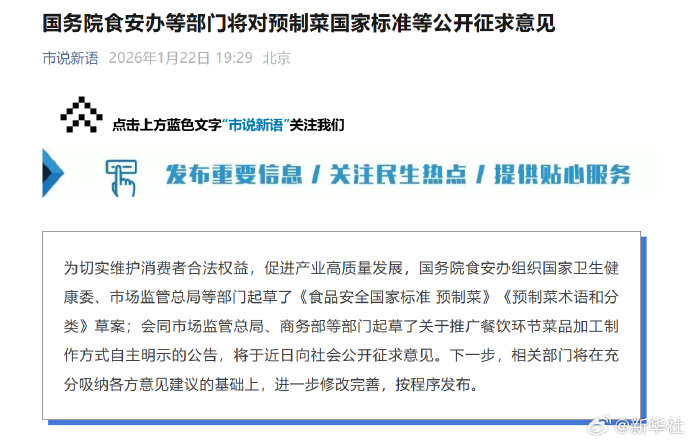 #预制菜将有国家标准#【国务院食安办等部门将#对预制菜国家标准等公开征求意见#】 为切实维护消费者合法权益,促进产业高质量发展,国务院食安办组织国家卫生健康委、市场监管总局等部门起草了《食品安全国家标准 预制菜》《预制菜术语和分类》草案;会同市场监管总局、商务部等部门起草了关于推广餐饮环节菜品加工制作方式自主明示的公告,将于近日向社会公开征求意见。下一步,相关部门将在充分吸纳各方意见建议的基础上,进一步修改完善,按程序发布。(国家市场监管总局网站)