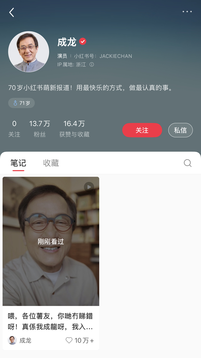 1月30日,成龙开通小红书账号,并发布首条视频。目前该账号粉丝数已达13.7万。