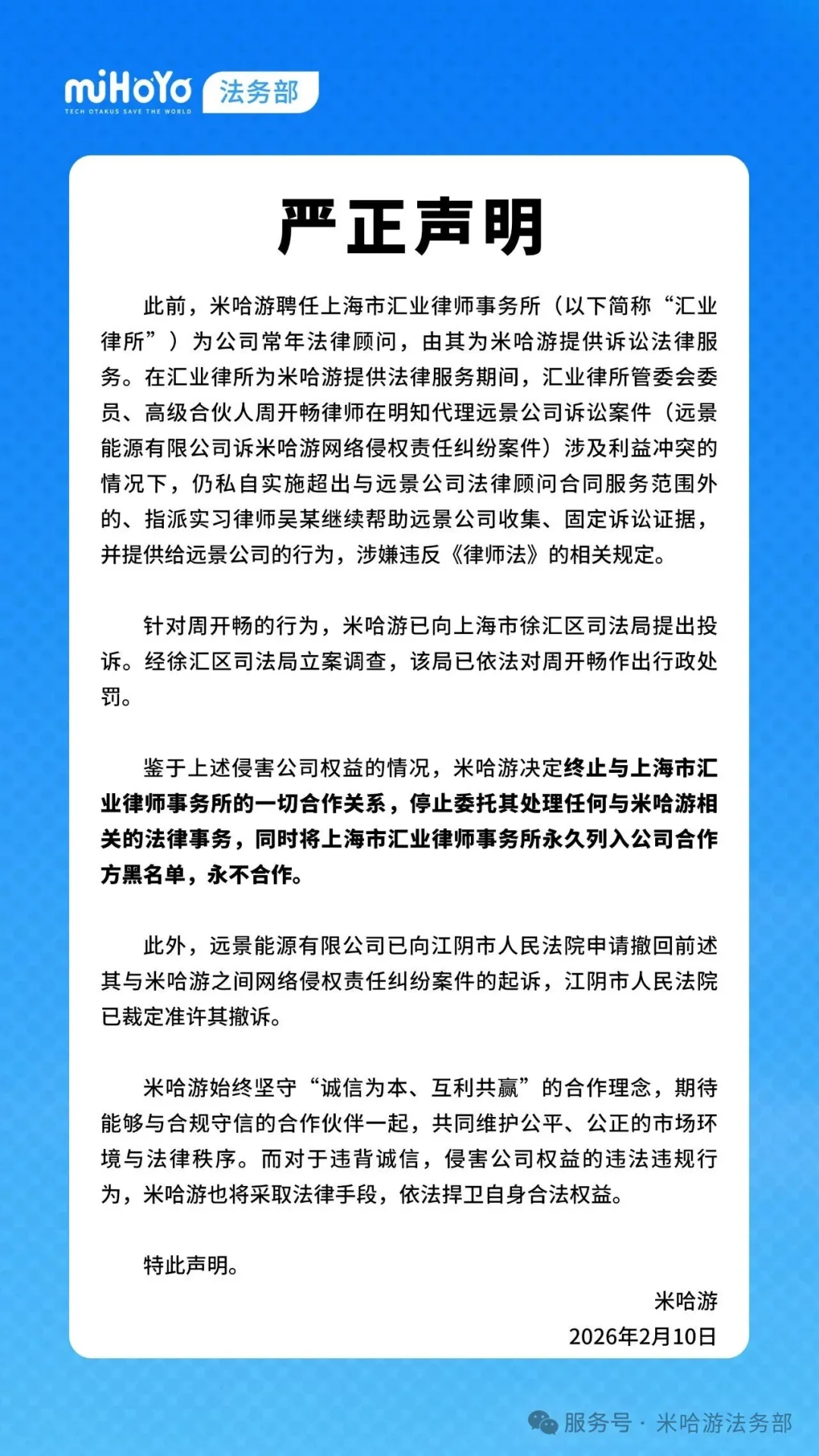 2月10日,米哈游发布声明,此前,米哈游聘任上海市汇业律师事务所(以下简称“汇业律所”)为公司常年法律顾问,由其为米哈游提供诉讼法律服务。