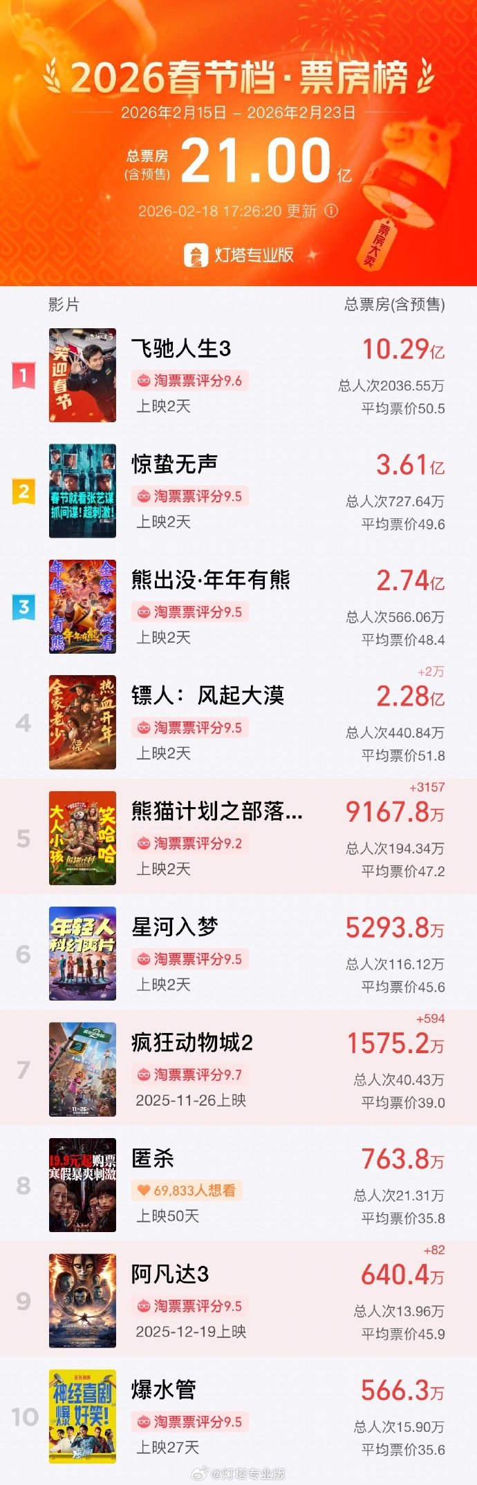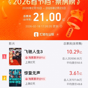 2026春节档总票房破21亿 界面新闻 界面新闻官方账号 02.1817:34 关注 据灯塔专业版,截至2月18日17时26分,2026春节档(2月15日-2月23日)档期总票房(含预售)突破21亿元。