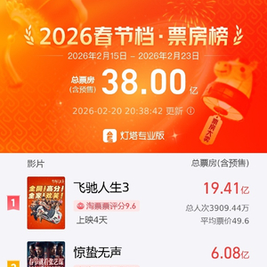 据灯塔专业版,截至2月20日20时38分,2026春节档(2月15日-2月23日)档期总票房(含预售)突破38亿。